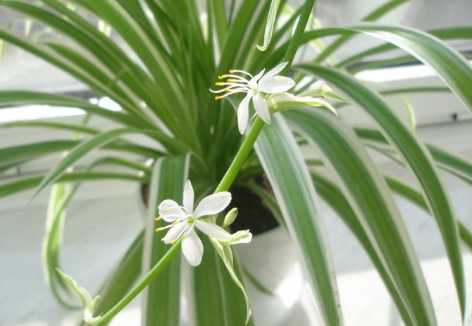 Из себя хлорофитум хохлатый представляет небольшой кустик, высотой до 60 см. Это популярное комнатное растение, которое культивируется около 200 лет на подоконниках, благодаря высокой устойчивости к заболеваниям и неприхотливости. Относят вид к роду хлорофитум семейства Лилейные. Из-за необычного цветения, растение часто выращивают в оранжереях и называют «лилией святого Бернара». Комнатный цветок в период цветения можете посмотреть на фото ниже: