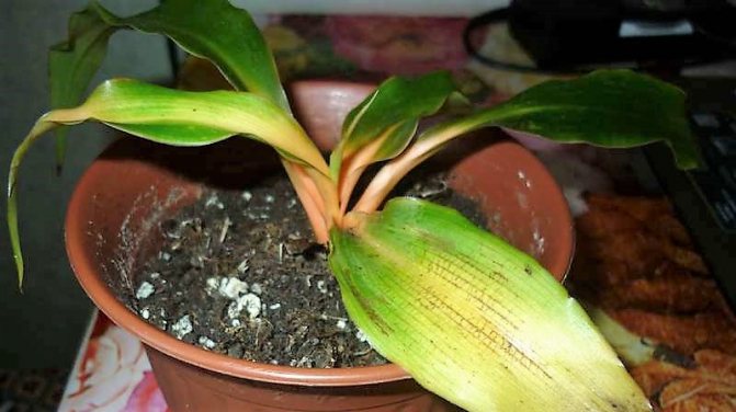 - Листья желтеют от того, что корневой системе цветка стало тесно в посадочной емкости – пора пересадить растение в новый горшок.