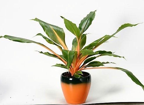 Крылатый хлорофитум еще называют оранжевым за характерный цвет черешка и центральной жилы. Куст не слишком большой – до 40 см в высоту, но смотрится очень эффектно за счет контрастного зелено-оранжевого перехода. В сезон он выпускает короткий цветонос с соцветием-початком.