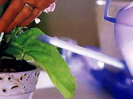 Верхний полив: аккуратно поливают ближе к краю горшка, не задевая наземные части цветка. Необходимо тщательно напитать весь земельный ком. При случайном попадании жидкости в зону роста рекомендуют промокнуть влагу салфеткой или ватным диском.