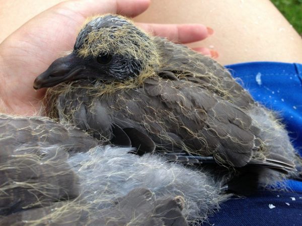 Если птенец голубя выпал из гнезда, по возможности его нужно попытаться вернуть на место. Иногда говорят, что, учуяв запах человека, птицы бросают гнездо и птенцов, однако на практике это происходит не так часто.