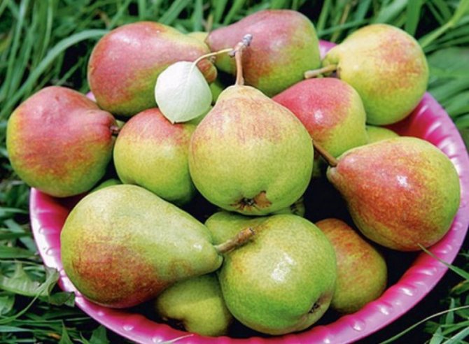Плоды имеют типичную грушевидную форму. Кожица тонкая, зеленовато-желтая. Спелые груши более желтые с выраженным румянцем на одном боку.