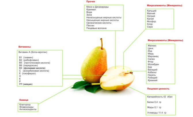 В состав некоторых сортов входит йод. Фрукт содержит 80% воды, а ее семена — 20% масла. Калорийность груши невысокая: 42 ккал на 100 г.