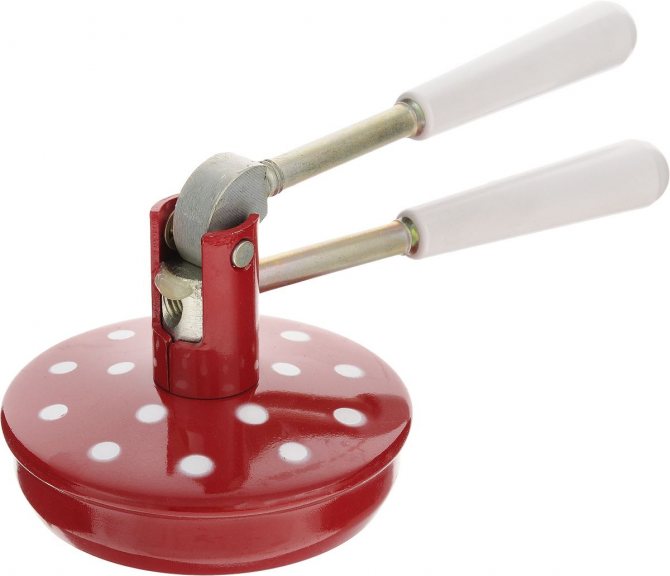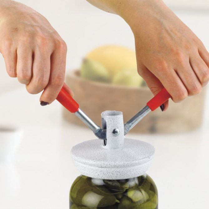 Машинка опускается на стерильную крышку, надетую поверх банки с заготовками, делается два или три оборота — всё готово! Крышка прочно прилегает к основанию горлышка.