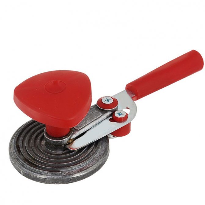 Принцип действия: ручку вращают по кругу, ролик обкатывает крышку и постепенно сжимает ее кромку.