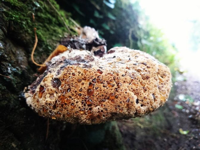 Вот и еще одно отличие от лиственничной губки. Судя по описаниям, внутри мякоть трутовика лиственничного светло-серая, беловатая или желтоватая. А вот коричневой она не бывает! В свежем виде мякоть этого трутовика мягкая, а позже легко крошится.