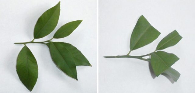 Листочки на черенке лимона необходимо подрезать, чтобы облегчить развитие корней. Самые маленькие верхние можно не трогать, остальные укоротить на треть, крупные наполовину.