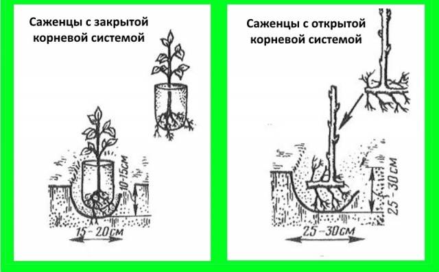 Важным показателем сроков посадки является то, к какому типу корневой системы относятся корни выбранных саженцев: к открытой или закрытой. При первом варианте посадка осуществляется как осенью, так и весной. Если выбор пал на растения с закрытой корневой системой, то высаживать его допустимо в любое время всего вегетативного периода. Это объясняется тем, что при закрытой корневой системе намного быстрее формируются развитые и сильные корни и побеги. Благодаря этому можно ждать первого плодоношения уже через 3 месяца после высадки.