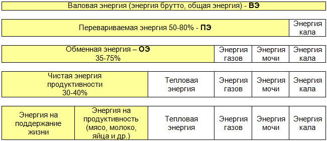 Основой любой системы энергетической оценки корма является знание всех энергетических потерь при превращении энергии корма в энергию на поддержание жизни и продуктивность.