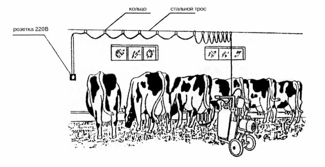Зафиксируйте подвижную часть кабеля к металлическим кольцам с помощью изоляционной ленты, проденьте стальную проволоку либо трос сквозь кольца и зафиксируйте его под крышей коровника, это позволит вам свободно и удобно перемещать доильную установку.