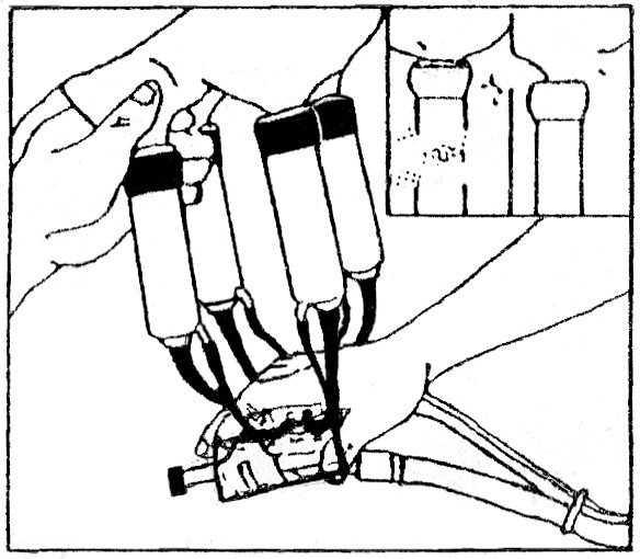 5.3 Для подключения доильной аппаратуры встаньте сбоку коровы, одной рукой возьмите молокоприемник так чтобы вакуумные патрубки и их металлический разветвитель находились сверху, а стаканы свободно свисали вниз. Другой рукой вы должны быстро надеть стаканы на соски по очереди один за другим как показано на рисунке 8. Во время операции лучше держать молочный патрубок одеваемого стакана с S-изгибом чтобы предотвратить попадание атмосферы в стакан.