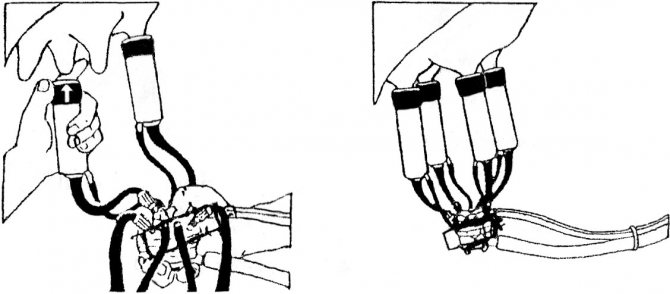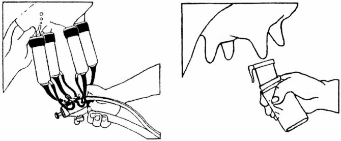 5.2 Перед началом доения необходимо вымыть вымя теплой водой и сделать массаж 2-3 раза сжав рукой каждый сосок, затем можно установить доильные стаканы и приступить к доению, как показано на рисунках 6 и 7.