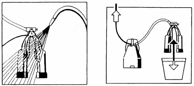 Стаканы для доения помещают на соски, следя, чтобы разветвитель из металла занимал положение сверху. В стаканах из нержавейки, надетых на вымя, должен сохраняться вакуум, который можно контролировать через прозрачное окошко. Емкость для приема молока необходимо держать рукой. В конце доения, чтобы сбросить вакуум, нужно открутить ручку регулятора.