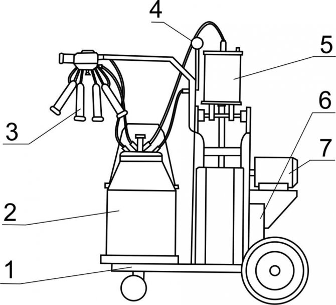 Доильная установка состоит из опорной рамы – 1 бидона для молока – 2, доильной аппаратуры – 3, вакуумметра – 4, поршневого вакуумного насоса – 5, редуктора и передаточного механизма – 6, электродвигателя – 7.