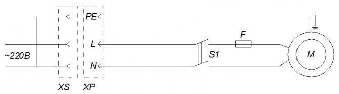 M — однофазный конденсаторный электродвигатель L – фазный провод N – нулевой провод РЕ – нулевой защитный провод XP – вилка штепсельная двухполюсная с заземляющим контактом XS – розетка штепсельная двухполюсная с заземляющим контактом S1 – выключатель F – предохранитель 8А