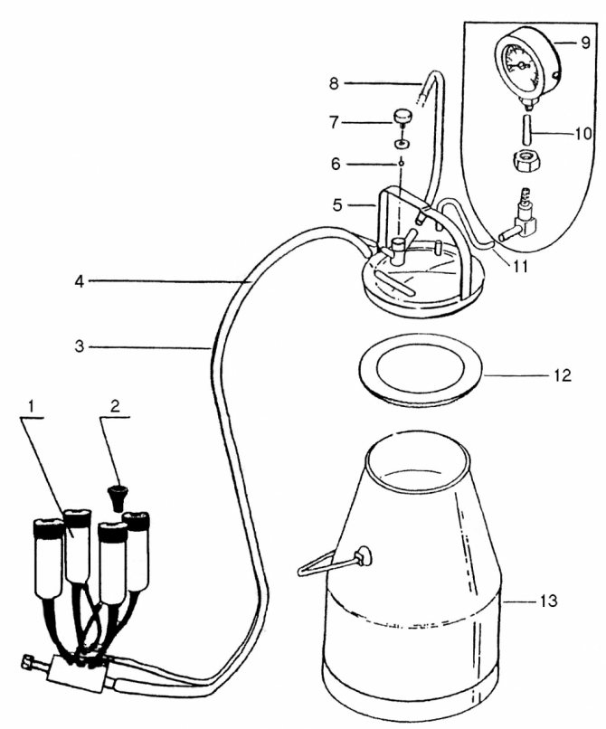 1 — Доильная аппаратура, 2 — Ложный сосок, 3 — Вакуумный шланг, 4 — Молочный шланг, 5 — Крышка бидона, 6 — Стальной шарик клапана Ø11, 7 — Уплотнительное кольцо, 8 — Пластмассовый винт ограничитель, 9 — Вакуумметр, 10 — Шланговое соединение вакуумметра, 11 — Патрубок вакуумметра, 12 — Прокладка крышки бидона для молока, 13 — Бидон для молока 22,6 л.