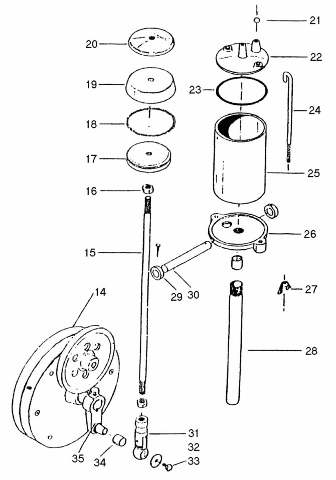 14 — Редуктор, 15 — Шатун, 16 — Гайка М16, 17 — Верхняя и нижняя прижимная планка и блок-прокладка, 18 — Кольцевая пружина, 19 — Поршень (Чаша из бычьей кожи), 20 — Прижимная букса, 21 — стальной шарик клапана Ø12, 22 — Крышка насоса, 23 — Прокладка крышки насоса, 24 — Прижим крышки насоса, 25 — Корпус насоса, 26 — Основание насоса, 27 — Прижимная гайка, 28 — Втулка шатуна, 29 — Втулка горизонтальной оси, 30 — Горизонтальная ось, 31 — Соединение кривошипа и шатуна, 32 — Ограничительная шайба, 33 — Болт М5*15, 34 -Подшипник №203, 35 — Кривошип.