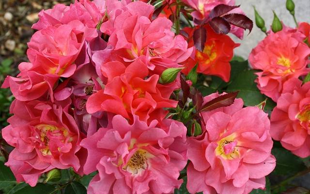 Schwerin – бутоны крупные, вытянутые. Цветет темно-красным цветом. Обычно в соцветии по 5-8 больших цветков. Кусты довольно раскидистые.