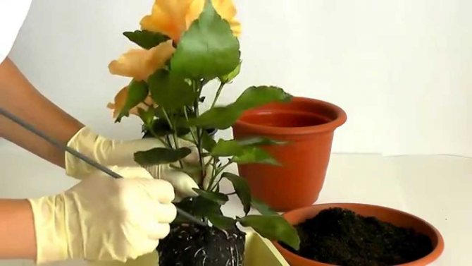 После пересадки куста гибискуса верхние части корневой системы должны находиться на поверхности земли. Дно заполняют камешками – керамзитом,чтобы улучшить дренажи обеспечить тесноту корням. Грунт для гибискуса должен иметь нейтральную среду, быть плодородным, но в то же время содержать глинистый дерн и крошку из древесного угля. Пересадку можно заменить подсыпанием плодородного грунта в горшок.
