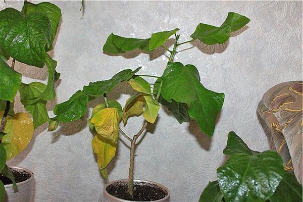Неравномерное пожелтение листьев или хлороз возникает при загнивании корневой системы, нехватке железа и азота, повышенном содержании в воде солей кальция и хлора.