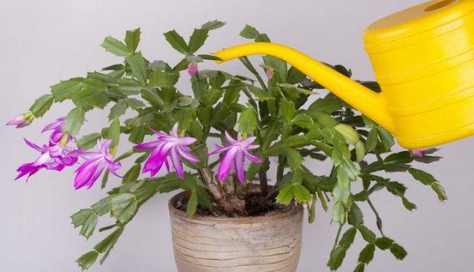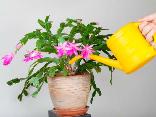 Для зигокактуса Декабриста нежелателен ни переизбыток влаги в горшке, ни ее нехватка. Особенно важно поливать растение на стадии распускания роскошных цветов. Но по завершению фазы цветения частоту процедур значительно сокращают.
