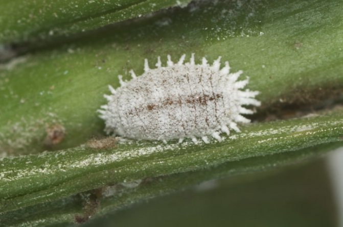 Это сосущее насекомое, у которого овальное розовое тело, покрытое белым налетом. На его спине присутствуют поперечные полоски. Длина паразита составляет 3-7 мм. Обнаружить мучнистого червеца можно по наличию белой липкой слизи на листиках цветка. Бутоны растения страдают от насекомого, увядают и опадают.