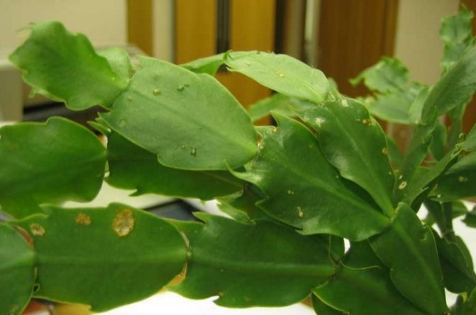 - Щитовку. Насекомое выдает себя наличием коричневых пятен на листьях экзотической культуры. Лечение нужно проводить при помощи инсектицида, протирая сегменты Декабриста.