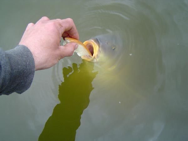 На фото — прикармливание рыбы