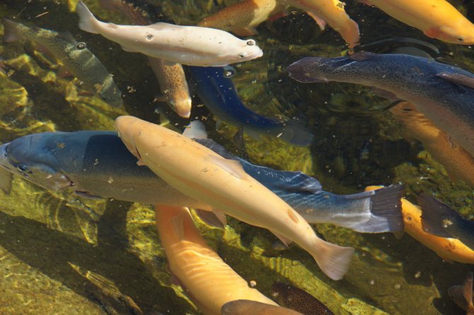 Далее по популярности идёт форель. К промышленному воспроизводству более всего пригодны ручьевая и радужная форель.