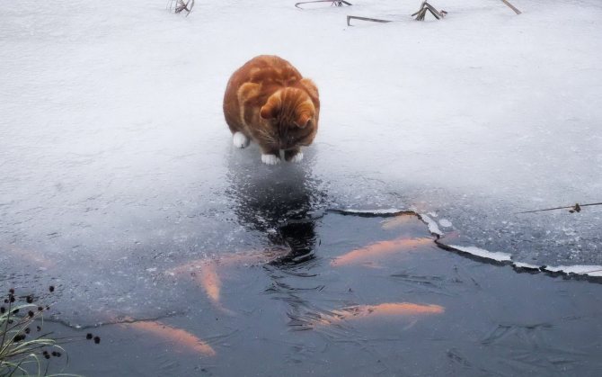 Чтобы рыбки могли перезимовать, не забывайте делать проруби в зимний период. Прекрасным решением станет тростник, который замораживается вертикально.