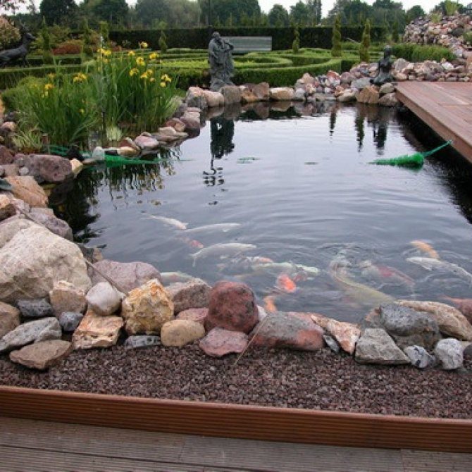 - Глубина и тип водоема должны быть подходящими для того вида рыб, которым планируется населить будущий пруд. Для большого количества рыб не подойдет маленький бассейн, к тому же обилие корма негативно отразится на чистоте воды. Чтобы рассчитать необходимый объем, следует учесть, что на одну особь длиной 10−15 см в норме приходится порядка 50 л воды. Не стоит также забывать о регулярном очищении воды, аэрации и прочих манипуляциях.