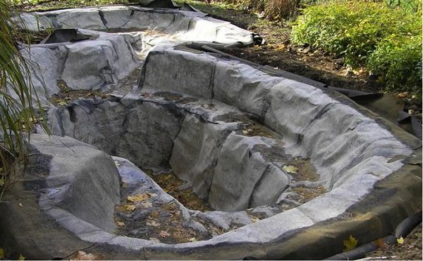 Вырытый котлован наполняется водой. Естественно, брать водопроводную крайне не рекомендуется. По возможности, постарайтесь найти родниковую или хотя бы колодезную воду. Советуем наполнять котлован постепенно. Сначала вы заливаете только 1/3 от общего объема воды, затем остальную часть. Это позволяет пленке идеально расправиться под влиянием тяжести воды.