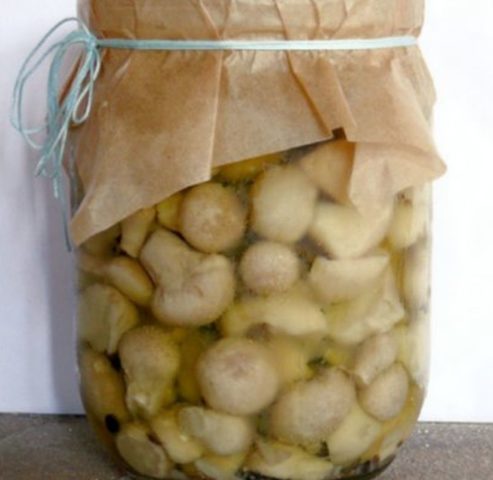 - в промытую банку 1 л насыпают нарезанные пластинками свежие пылевики, заполняя сосуд наполовину;