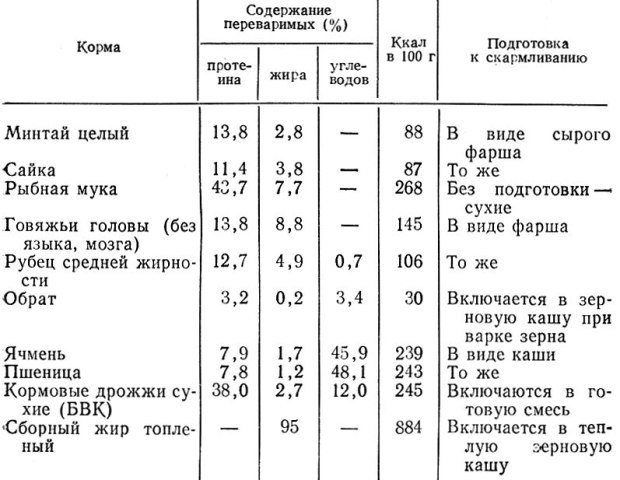 По количеству протеина и его процентному содержанию в кормах определяют, сколько надо давать того или иного корма в граммах. Например, с минтаем даем (6,25X0,20) 1,25 г переваримого протеина. Это количество протеина содержится в 9 г минтая, с которым мы вводим в рацион 0,25 г жира и 7,9 ккал обменной энерг