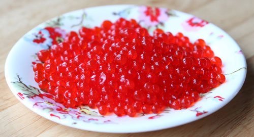 Икрой лососевой структурированной называют искусственно созданную икру. В состав входит желатин на рыбьем бульоне и краситель.