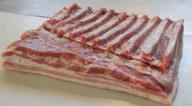 Это толстая часть брюшины, расположенная близко к пояснице. Она очень богата жиром, используется для копчения и жарки, запекания в фольге. Очень хороша грудинка в луковой шелухе.