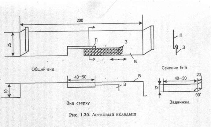 Постоянная прилетная доска изготовлена из доски шириной 50 мм. Обязательное условие для крепления доски: нижняя ее кромка не должна препятствовать выниманию поддона, который в этом улье может выниматься как вперед, так и назад. Весной и осенью леток закрывается при помощи легкового вкладыша, из тонкого металла (рис. 1.30).