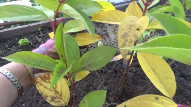 Если листья начали желтеть из-за повреждения корней, вызванного неправильной агротехникой, гортензию необходимо пересадить. При этом поврежденные участки корневой системы удаляют. В посадочных ямах увеличивают слой дренажа и добавляют дополнительные кислотные удобрения.