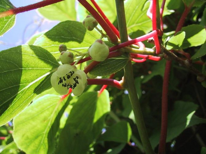 Актинидия является двудомным растением. Для обеспечения плодоношения необходимо рядом высаживать две лианы: женскую и мужскую. Различить их можно во время цветения. У женских особей цветки одиночные, реже бывают собраны в небольшие соцветия по три штуки. Цветки имеют хорошо выраженный пестик. Мужское растение отличается мелкими, собранными в зонтичные соцветия цветочками, в которых можно обнаружить только тычинки с чёрными пыльниками.